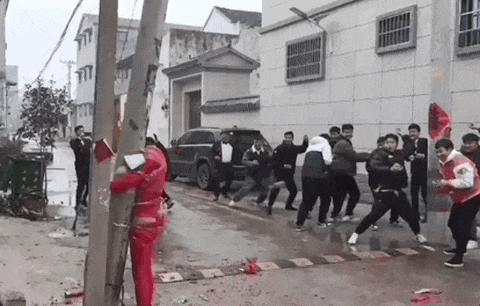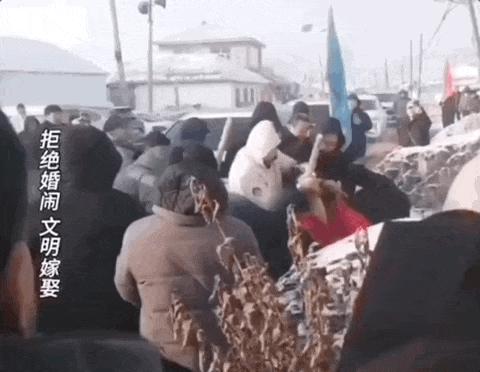接新娘时,人群蜂拥而至,推搡、拉扯、打闹,不知情的人以为是群殴现场。