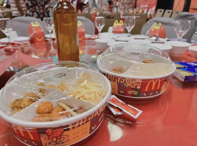 现在的年轻人,却把西式婚礼办进了麦当劳,来宾人手一份汉堡薯条。反正酒店的婚宴也多是预制菜,那就不必装了。