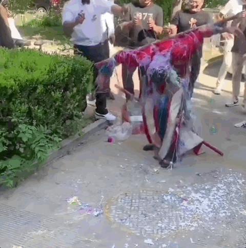 更过分的,是把新郎当众用胶带绑在电线杆上,人群围观,手机拍摄,新郎被泼油漆,扣臭豆腐、鱼籽鱼泡的混合物,一个西瓜砸在头顶,碎裂开来。
