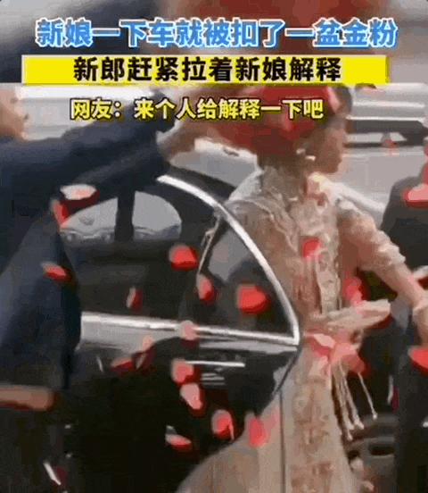 金粉、麸子被倒在头上,顺着领口钻进衣服里,精心打理的发型、妆容、礼服,全毁,甚至连婚车也被泼得乱七八糟。