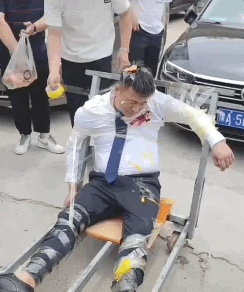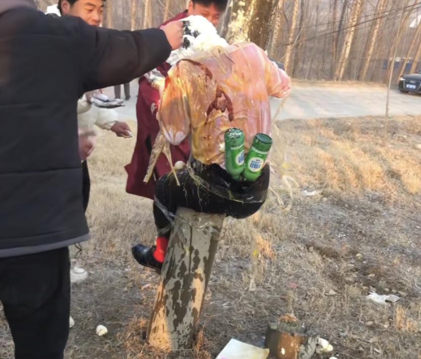 有人扛来一袋鸡蛋,挨个砸在新郎头上,鸡蛋碎裂,蛋液顺着西装往下淌,然而被绑得动弹不得,只能忍受。