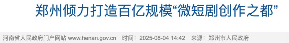 起因或源自前不久出台的《郑州市打造 " 微短剧创作之都 " 工作实施方案(2025 — 2027 年)》,提出了一个雄心勃勃的目标:着力打造 " 微短剧创作之都 "。