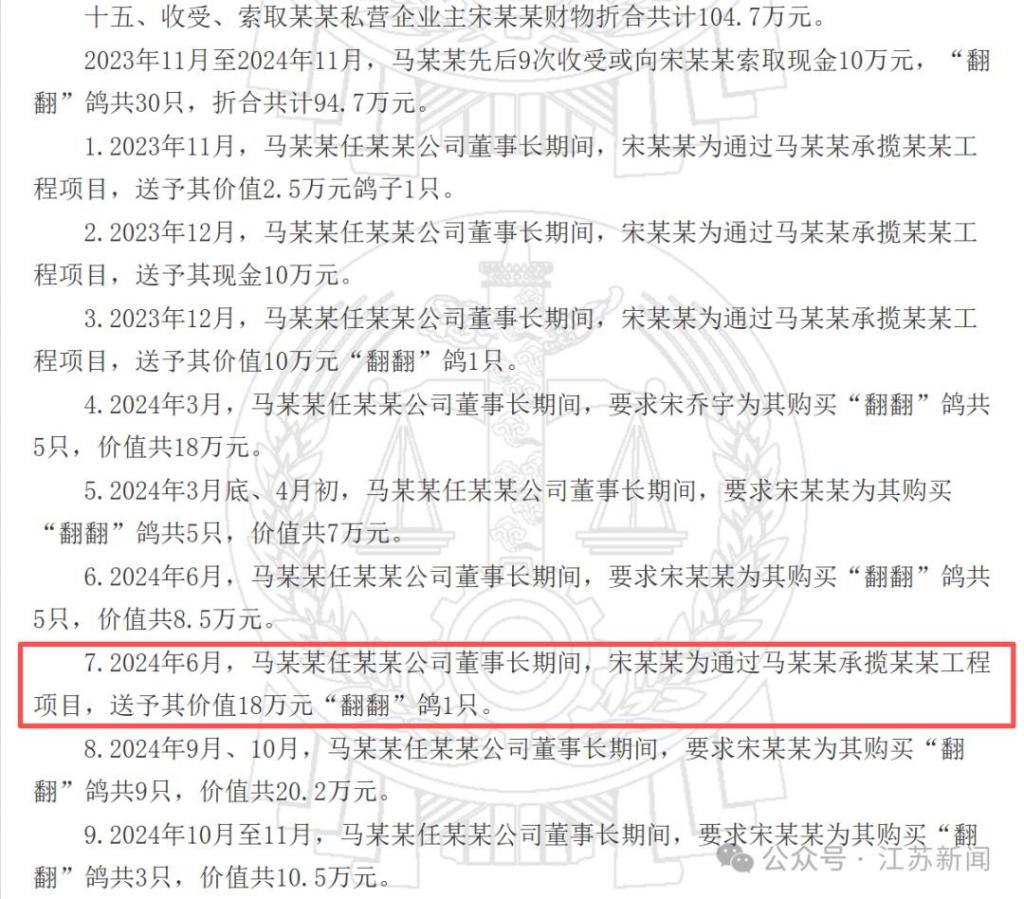 据红星新闻报道,马某某收受的 110 万金钱中,有马某某主动索取的,也有行贿者主动送的。但其收受的 95 只 " 翻翻鸽 " 中,几乎都是他主动向管理对象索取的。在送鸽的人中,私营企业主宋某宇出手最大方,其送给马某某 " 翻翻鸽 "30 只,价值 94.7 万元,其中价值 18 万元 1 只、价值 10 万元 1 只;送鸽子最多的是一矿业有限责任公司采矿队队长卢某某,其在 2023 年 3 月、4 月两个月内,送了马某某 48 只 " 翻翻鸽 ",最多的一次送了 28 只。