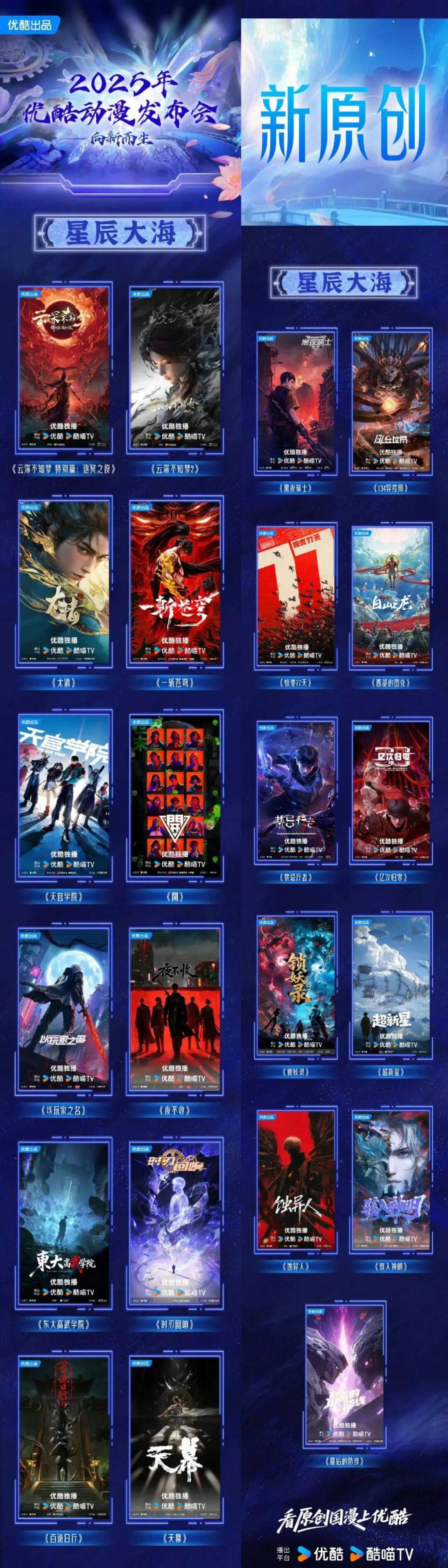 而今年的重头戏原创新作对应的 " 星辰大海 " 板块,涵盖的 23 部作品占优酷动漫片单总量的一半以上,充分显示出平台在原创孵化与内容自研上的投入大幅升级。