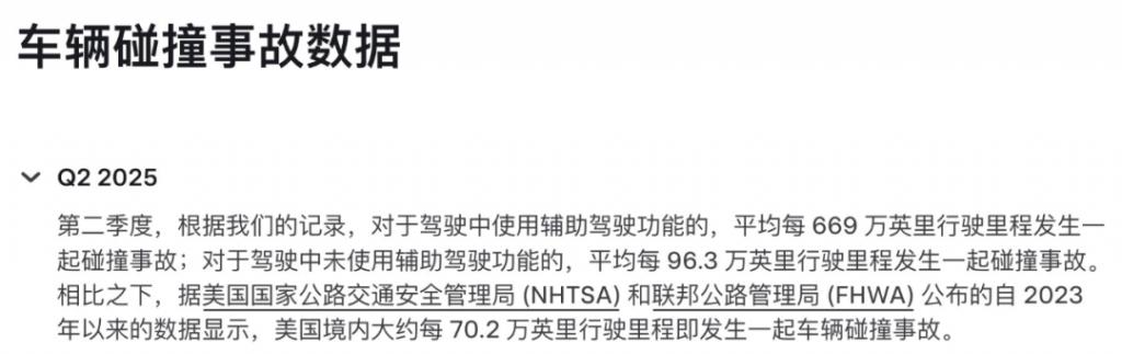 特斯拉 2025 年第二季度安全报告显示,开启 Autopilot 或 FSD 辅助驾驶功能的车辆,平均每行驶 669 万英里发生一起事故,而未使用辅助驾驶的特斯拉车辆,每 96.3 万英里发生一次事故。相比之下,据 NHTSA 和联邦公路管理局(FHWA)公布的自 2023 年以来的数据,美国境内大约每 70.2 万英里行驶里程即发生一起车辆碰撞事故。