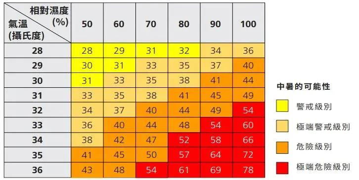△香港职业安全局发布的中暑温度实验数据。(图 / 香港职业安全局)