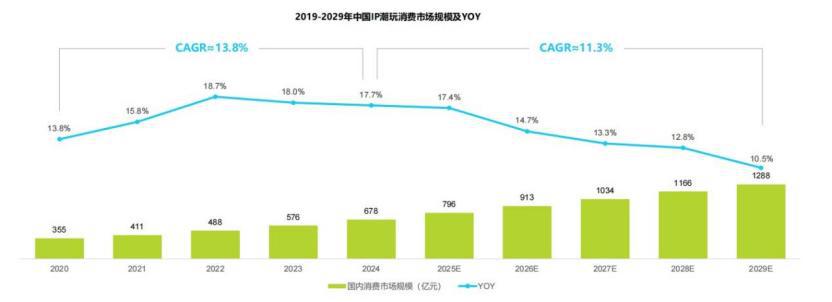 另一方面,年轻人重视的情绪消费、体验消费,仍有大增量。《中国潮玩与动漫产业发展报告(2024)》数据显示,中国潮玩产业总价值预计到 2026 年将攀升至 1101 亿元,年均增速超过 20%。