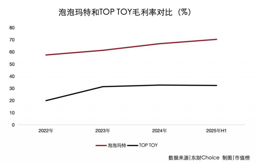 2025 年上半年,泡泡玛特的毛利率高达 70.3%,远高于 TOP TOY 的 32.4%。