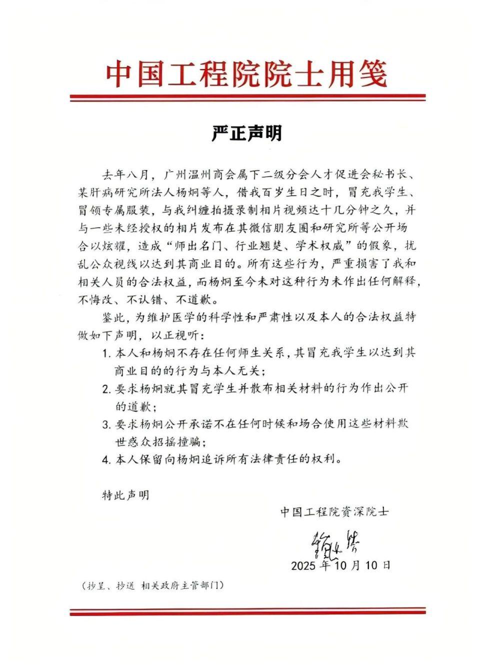 10 月 11 日,一份由百岁院士手书签字并委托发布的 " 严正声明 ",将一场 " 冒用师门、蹭合影 " 的争议推至台前。