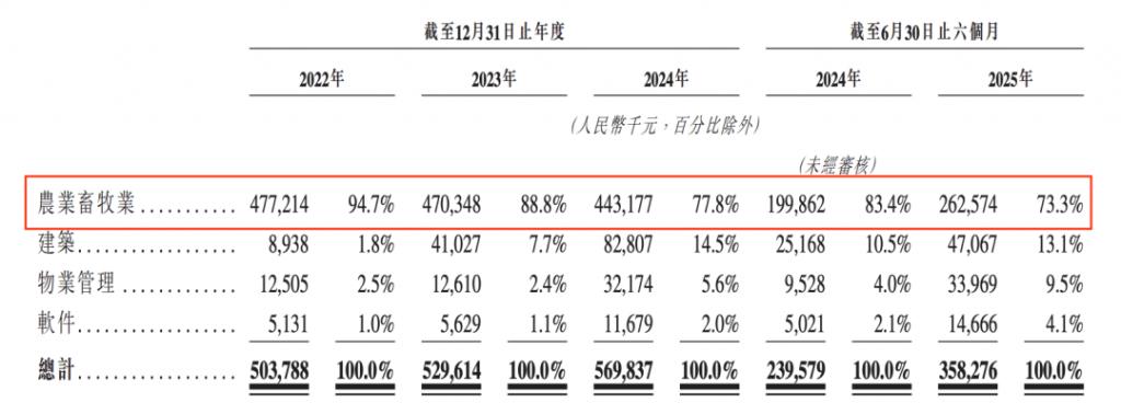 2022 年、2023 年、2024 年及 2025 年上半年(以下简称 " 报告期内 ")FJD 的农业畜牧业营收分别为 4.77 亿元、4.7 亿元、4.43 亿元及 2.63 亿元,占比从 2022 年的最高 94.7% 降至 2025 年上半年的 73.3%,但依然超过 7 成,是公司绝对的核心业务。