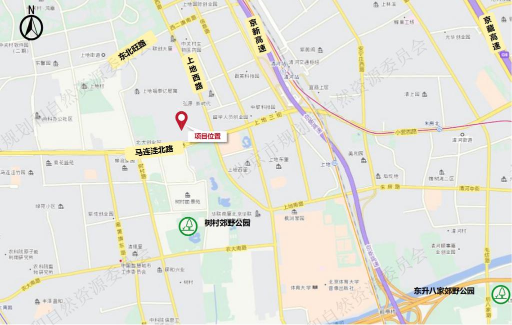 该地块处在上地西路和马连洼北路交汇处,京新高速的西侧,紧挨北大创业园,距离 13 号线和昌平线换乘站—清河站约 1 公里,距离另一地铁站—上地站约 1.5 公里。北侧约 1 公里处即是有名的中关村软件园,腾讯、联想等大厂遍布。
