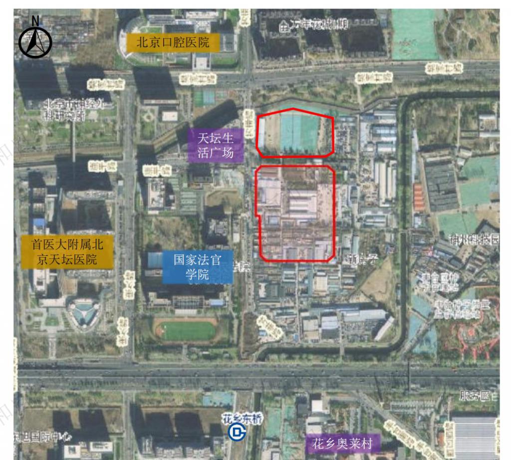 地块所在版块是丰台区较为成熟区域,地块往西是天坛医院,北边是北京口腔医院;往南不远是花乡奥莱村,丰科万达、资和信百货、鑫嘉汇购物中心等商业也都在 3 公里范围内。
