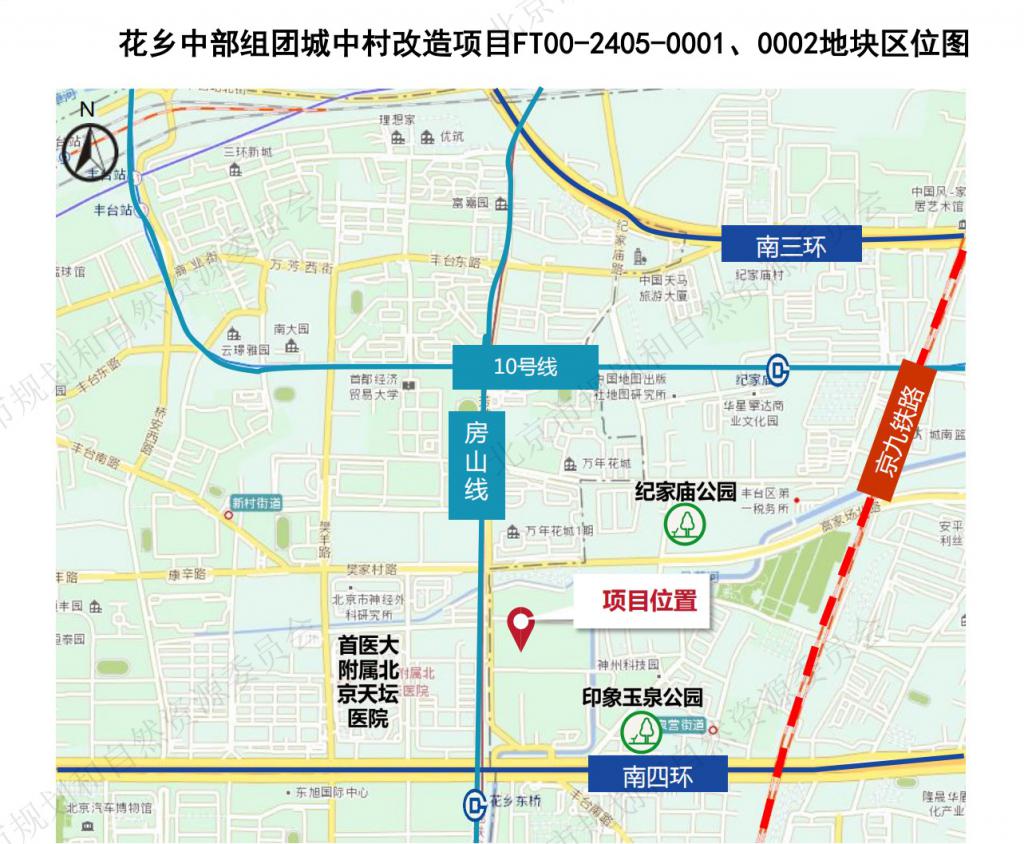 这宗 FT00-2405-0001、0002 地块,位于丰台区玉泉营街道,处在南三环和南四环之间,邻近地铁房山线花乡东桥站(约 300 米)、地铁 10 号线与房山线换乘首经贸站(约 700 米)。该地块为 R2 二类居住用地,用地面积约 7.16 万平米,建筑规模约 17.92 万平米。