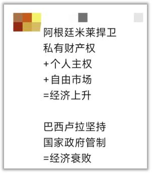 以往阿根廷经济差,都是因为左派政府干预经济。政府的管制只会带来腐败与衰退,让民众走向被奴役的道路。
