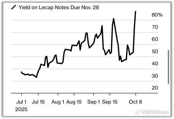 与此同时,10 月 31 日到期的政府债券 Lecap 的收益率从前一日的 76% 跃升至 97%;11 月 28 日到期债券的收益率也从 74% 涨到了接近 87%。