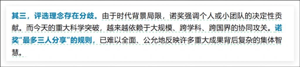 最离谱的是说评选理念存在分歧,理由是诺奖是几个人评出来的,这几个人根本不了解那些很大规模的学术成果,忽视了那些集体智慧。
