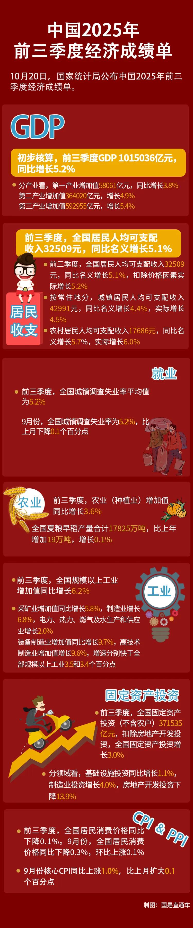 三季度中国经济数据 20 日公布。据国家统计局数据,前三季度,国内生产总值(GDP)同比增长 5.2%,比上年全年和上年同期分别加快 0.2、0.4 个百分点;经济增量达到 39679 亿元,同比多增 1368 亿元。