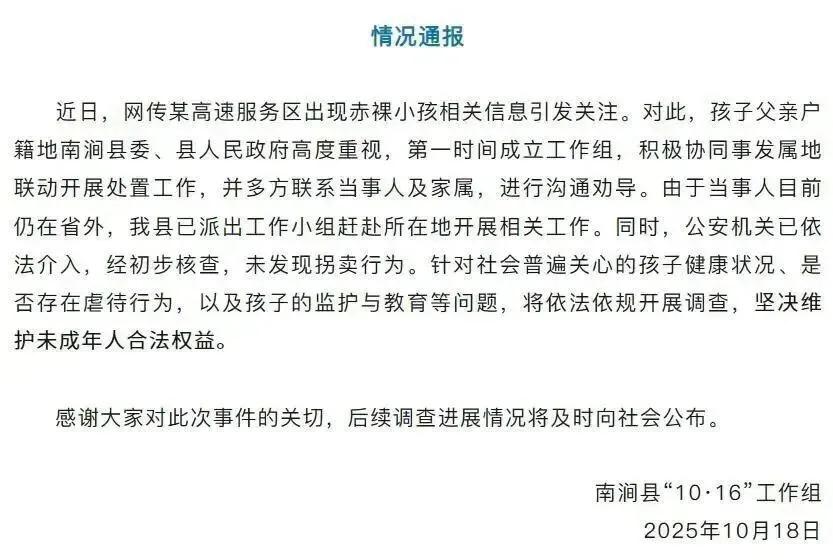 与此前当地警方说孩子父母 " 不存在虐待 " 的表述不同,工作组在 10 月 18 日发布的情况通报中特别提到 " 将对是否存在虐待行为,依法依规展开调查 "。