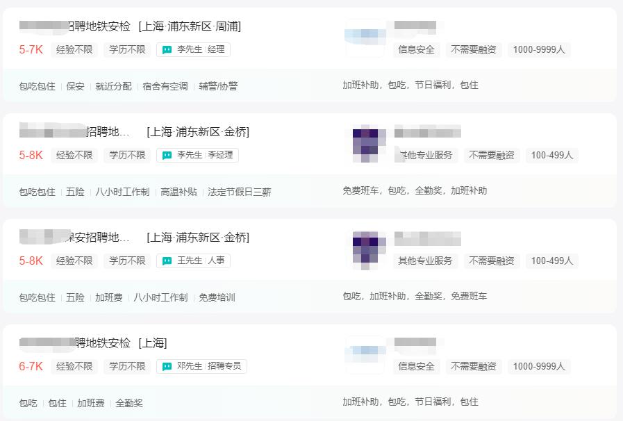 在招聘网站上搜索上海地铁安检员的招聘信息可以发现,招聘方多是第三方劳务公司,上班时长虽写着 8 小时工作制,但还有 " 加班工资 "。