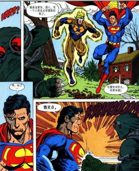 没错,手撕了!溅了超人一脸液体,于是超人也被感染了。此时,外星侵入,超人一边控制着自己体内被感染,一边和超级英雄们一起抵抗外星人的入侵。