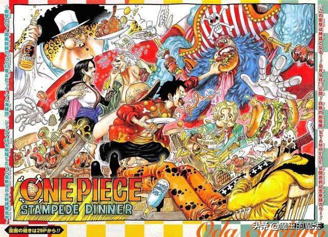 本期的故事扉页换成了卷头彩页内容,由于海贼王剧场版即将上映,本期卷头彩页也是为了加强宣传,特意绘制了与剧场版相关的内容,从内容上看,是路飞和剧场版STAMPEDE出场人气角色们一起吃肉的情景,还是非常有趣的,除此之外,本篇章还有夏日番外篇,主要讲述的是草帽一伙9人齐聚的内容!可以说本话的内容也是福利满满,说完了扉页故事,我们来看下一下本章的故事正文内容!