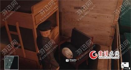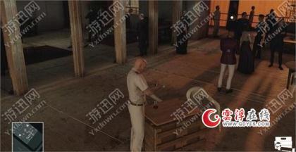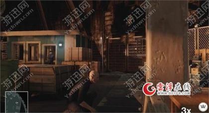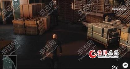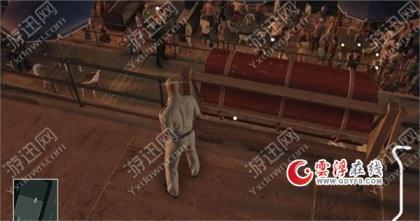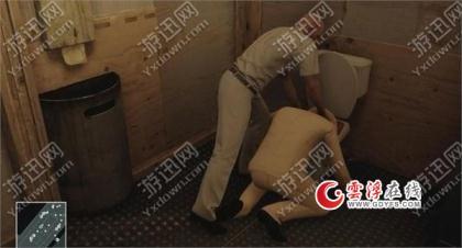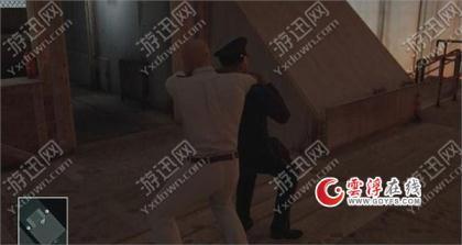 潜入0层甲板后,找到那个背对站着不动的警员,在图示位置放下一把手枪,然后躲在木箱后面。