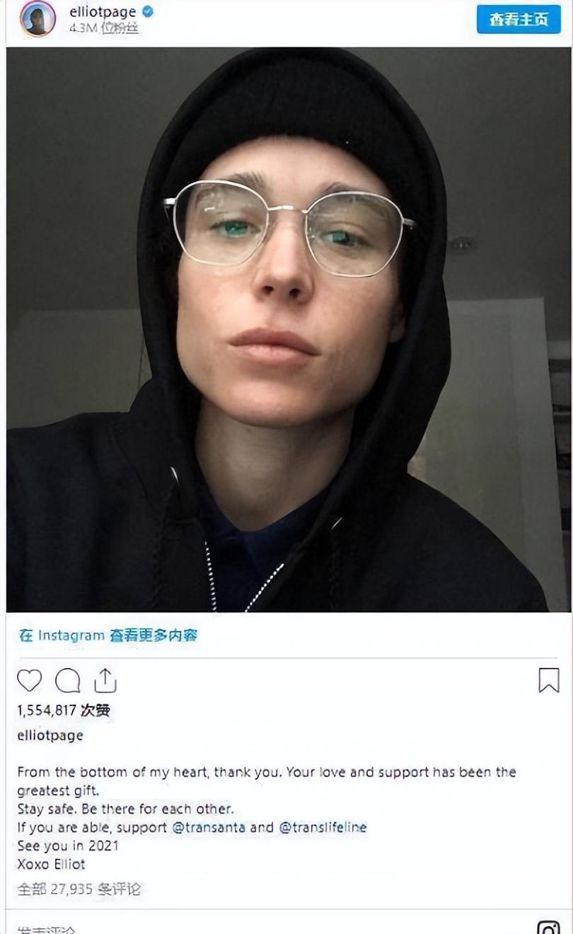 而这个演员艾伦·佩吉在2020年,宣布自己为跨性别者,还将自己的名字改成了艾略特·佩吉。