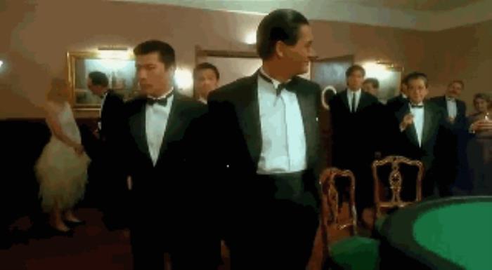 当发哥穿着黑色西装,从门外走进来的时候,他光用个人气质就撑起了整个场面,身边的所有人顿时沦为背景,配合一首经典BGM,造就了“赌神出场”的港片经典片段。