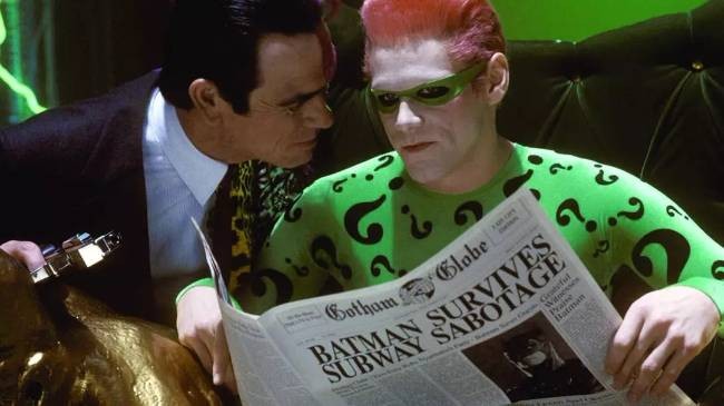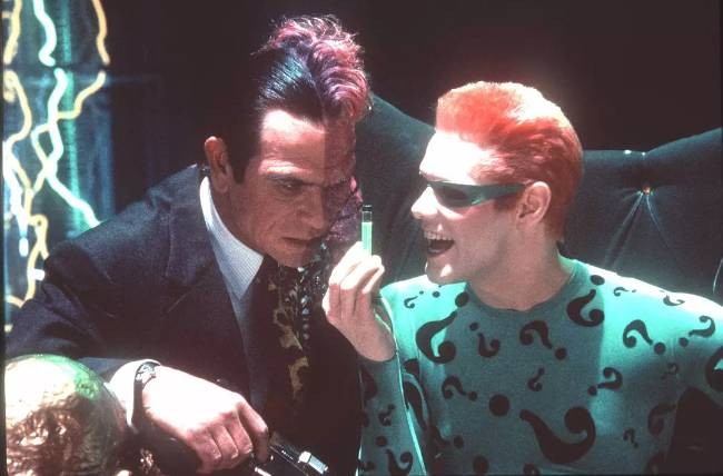 忘了说一句,《蝙蝠侠归来》的反派是汤米李琼斯饰演的双面人,和有欧美“周星驰”之称的金凯瑞饰演的谜语人。