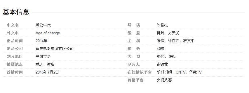 《风云年代》是由刘雪松执导,张铎、徐百卉、石文中领衔主演的年代谍战剧 。