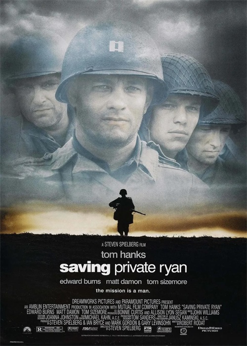 影片《拯救大兵瑞恩》是梦工厂1998年出品的一部战争电影,由史蒂文·斯皮尔伯格执导,汤姆·汉克斯、汤姆·塞兹摩尔和马特·达蒙等联袂出演。影片于1998年7月24日在美国上映。电影描述诺曼底登陆后,瑞恩家4名于前线参战的儿子中,除了隶属101空降师的小儿子二等兵詹姆斯·瑞恩仍下落不明外,其他3个儿子皆已于两周内陆续在各地战死。美国陆军参谋长马歇尔上将得知此事后出于人道考量,特令前线组织一支8人小队,在人海茫茫、枪林弹雨中找出生死未卜的二等兵詹姆斯·瑞恩,并将其平安送回后方。