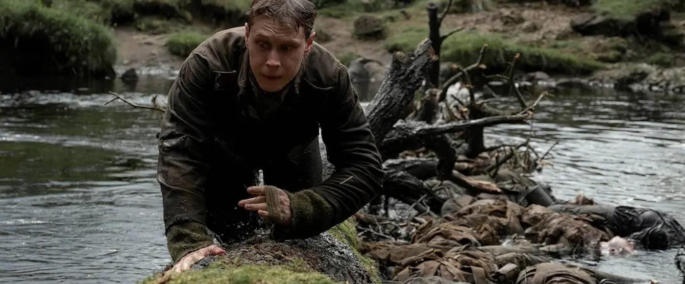 影片以一个极具传奇色彩和象征意义的镜头开始,一只狼在白雪覆盖的森林之中伺机而动,狼的眼睛紧盯着猎物,一匹作为诱饵的马。之后,一只被伪装过的猎枪和幼年的瓦西里出现在画面中,他神色坚毅却无法掩饰那份面对猛兽的紧张,狼开始冲向猎物,速度逐渐加快,而瓦西里的枪却开始在颤抖,在爷爷的不断催促下,少年瓦西里终于开枪了,而镜头直接切到成年后准备去参战的瓦西里。通过后面的闪回,我们知道少年瓦西里因为恐惧和紧张,那一枪并没有击中狼,在狼撕咬白马的时候是爷爷射杀了狼,也给少年瓦西里上了可能是生命中最重要的一堂课,在面对强大的敌人时,要像石头一样冷静,机会出现时要勇敢果决甚至冷酷,不可有一丝迟疑和惊慌。