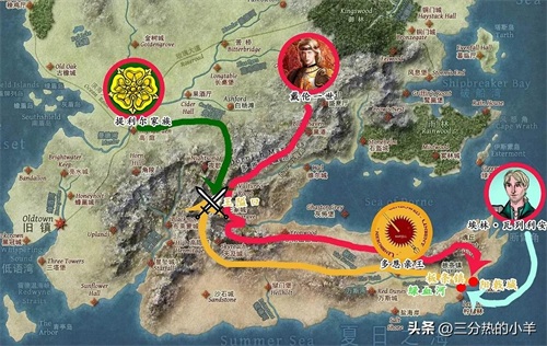 兵分三路:莱昂诺·提利尔进攻亲王隘口;戴伦绕过骨道秘密长驱直入多恩腹地;埃林·瓦列利安从海上进攻板条镇