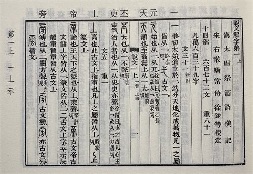 (《说文解字》第一页,可以见到其中的“古文”)