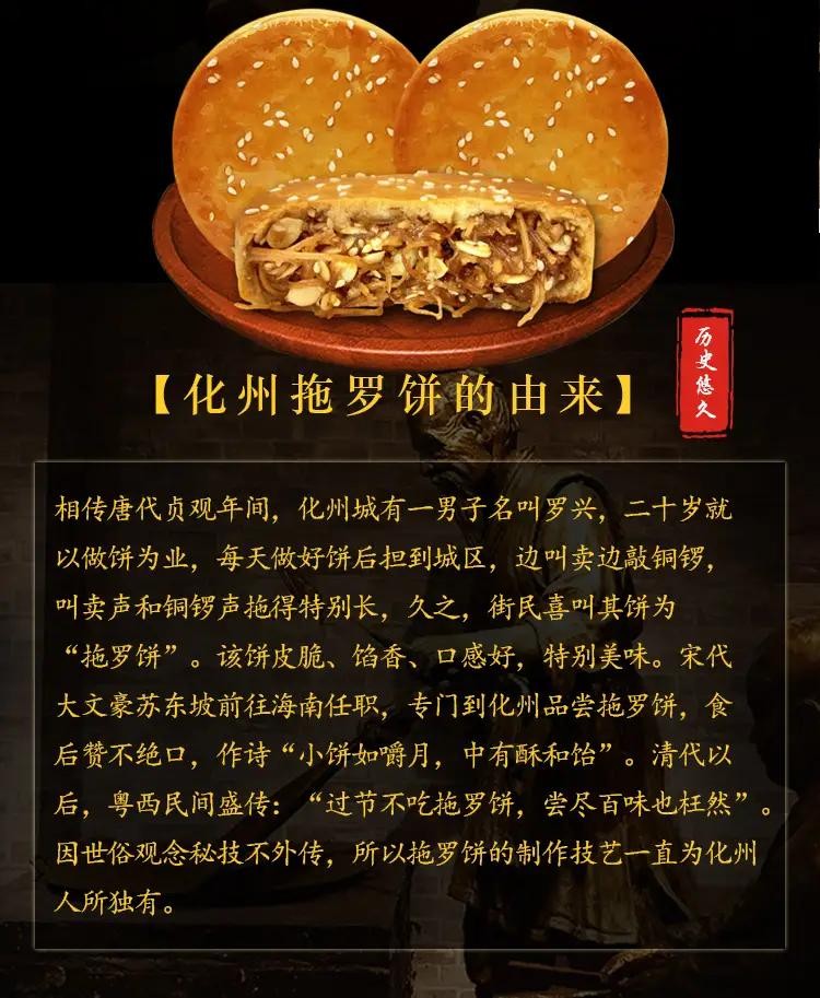 拖罗饼其色泽金黄,皮脆酥香,内里添加了椰子丝、叉烧、伍仁、白芝麻等丰富的馅料,化州人都说:“中秋不吃拖罗饼,尝尽百味也枉然。”