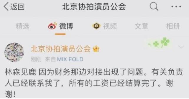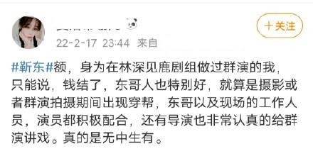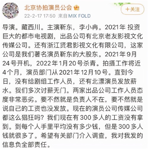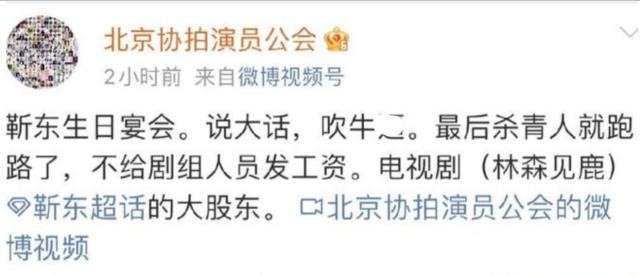 那么究竟是发生了什么,让怒气上头的靳东发了这么一则动态呢?原来,有昵称为“北京协拍演员公会”的网友爆料称靳东所在的《林深见鹿》剧组拖欠演员以及农民工工资,拖欠工资人数高达300余人。