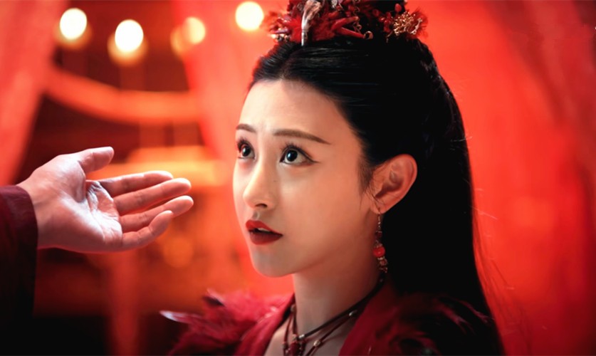 红衣鲜艳夺目,依然是羽毛点缀的头饰,镜头展现得挺有质感,加上同色系的耳环项链,衬得女主肤白如雪。