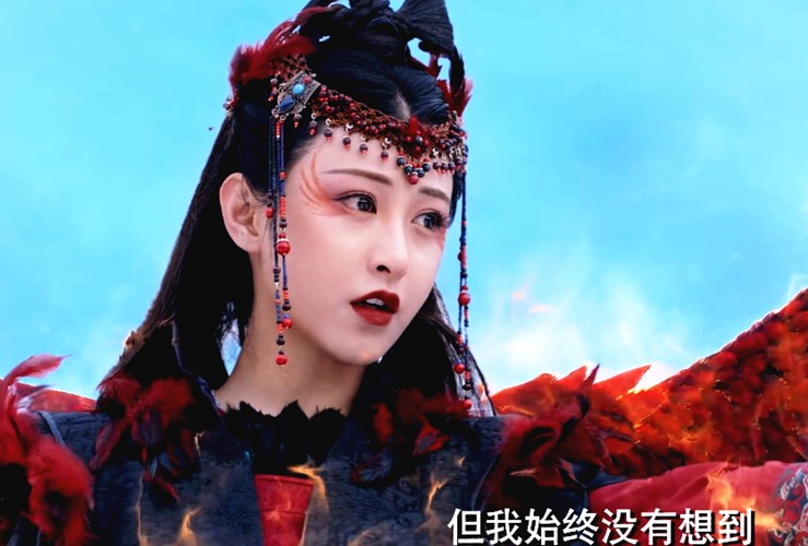 《冰火凤》中的千雪妭黑化后不但一秒化了个粗黑的眼线,眼角还画上了凤尾形状的红色眼妆。