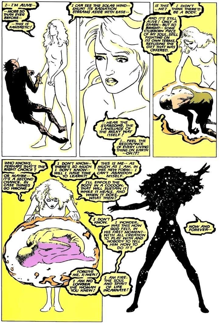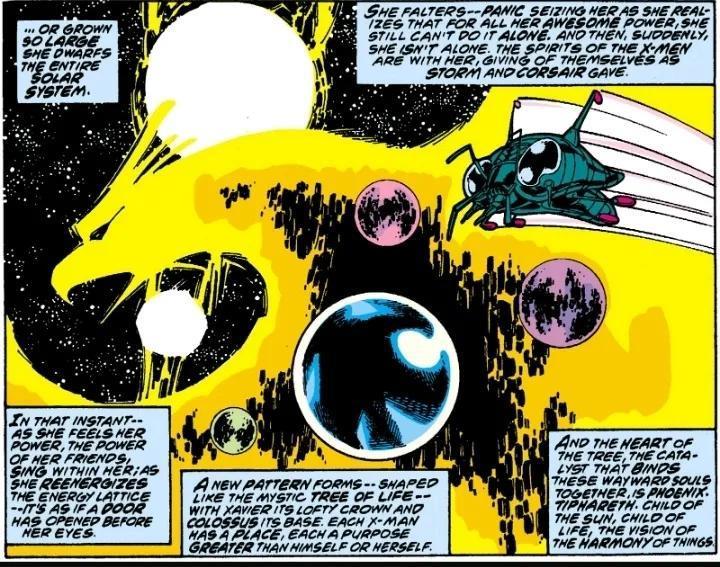 凤凰成长到超过太阳系的尺寸,在其他X战警协力下形成生命之树,由琴担任生命之树的心脏,将这些灵魂维系再一起。