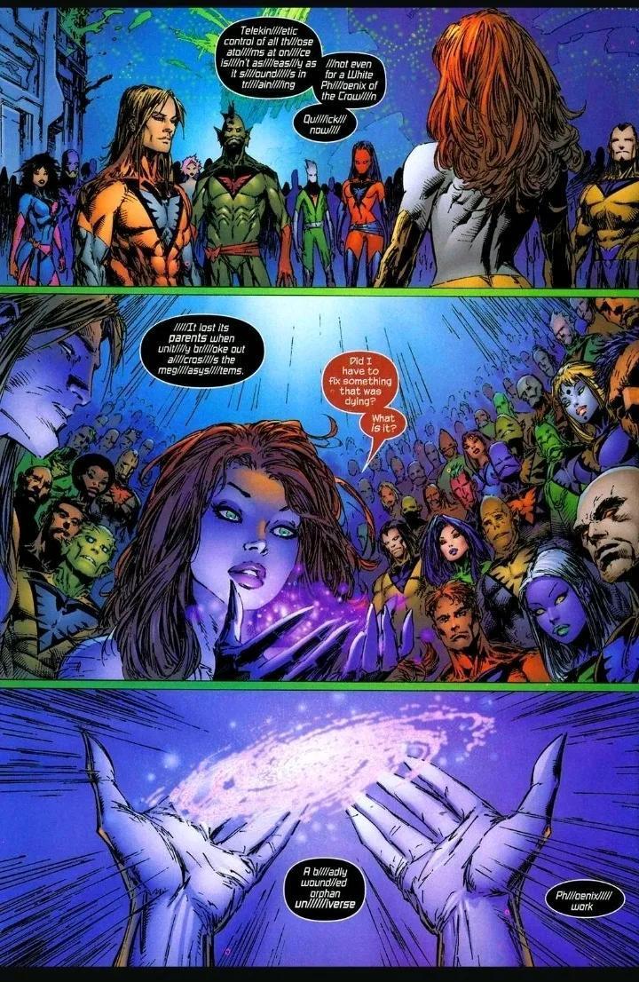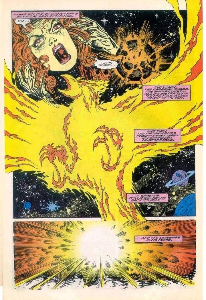 在Earth-81727,失控的凤凰之力在一瞬间杀死X战警和所有Shi’ar禁卫,最终摧毀整个宇宙。