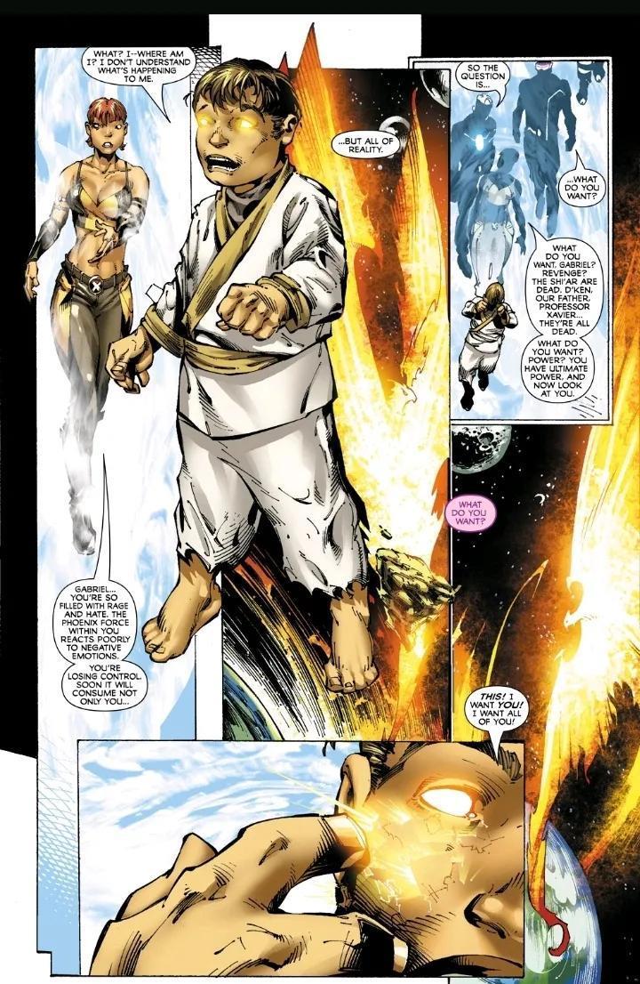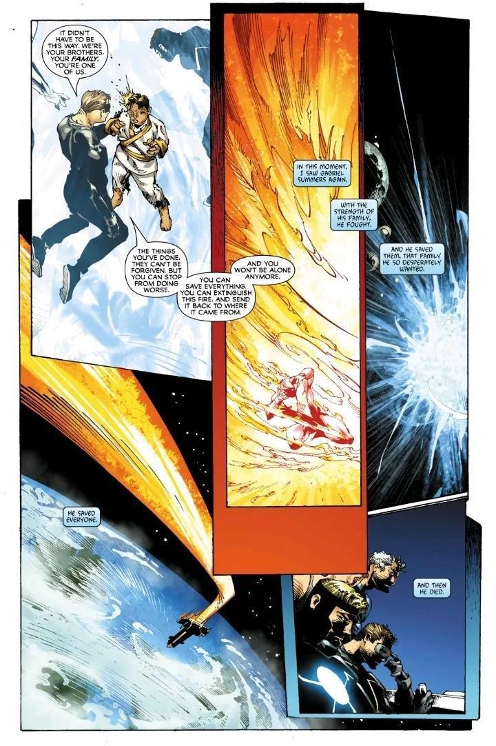 瑞秋指出凤凰之力在充满愤怒和憎恨的加百列·萨默斯手中,将会吞噬所有现实独眼龙说服他将凤凰之力归还原主,他照做并死去了。随后琴作为白凤凰现身在加百列面前安慰他,并声称自己总是对萨默斯家的人情有独钟。