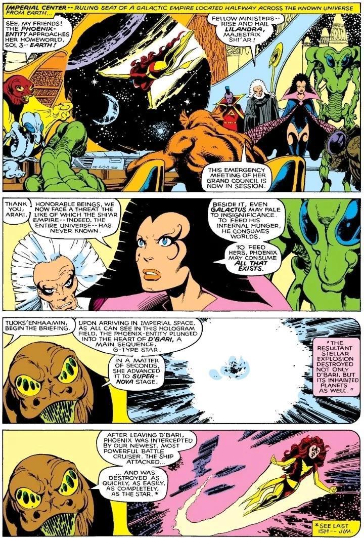Lilandra指出和黑凤凰带来的威胁相比,即使是吞星也无足轻重。吞星吞噬世界来满足他地狱般的食欲,凤凰则可能吞噬所有存在。