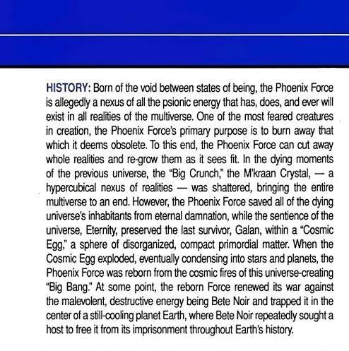 凤凰之力诞生于存在状态之间的虚空,据称是所有灵能的纽带,它永远存在于多元宇宙的所有现实中。 作为世界上最可怕的生物之一,凤凰之力的主要目的是烧毁它认为过时的东西。为此,凤凰只力可以切断整个现实,并在它认为合适的时候重新培育它们。在前一个宇宙的濒死时刻,“大收缩”,即M'kraan水晶——一个超立方体的现实联系——被粉碎,导致整个多元宇宙走向终结。然而,凤凰之力将所有垂死的宇宙居民从永恒的诅咒中拯救出来,而宇宙的知觉,永恒,将最后的幸存者吞星,保存在一个“宇宙蛋”中,一个无序的,紧凑的原始物质的球体。当宇宙蛋爆炸,最终凝结成恒星和行星时,凤凰力从这个创造宇宙的“大爆炸”的宇宙之火中重生。