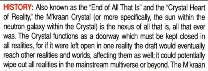M'Kraan水晶一旦放任于现实开启,最终将触及和影响其他现实和世界,极可能抹除主流多元宇宙以上的所有现实。