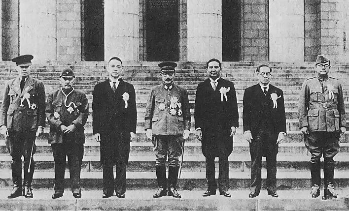 日本“大东亚共荣会议”参与者。左起:巴莫、张景惠、汪精卫、东条英机、旺·威泰耶康、劳雷尔、鲍斯。