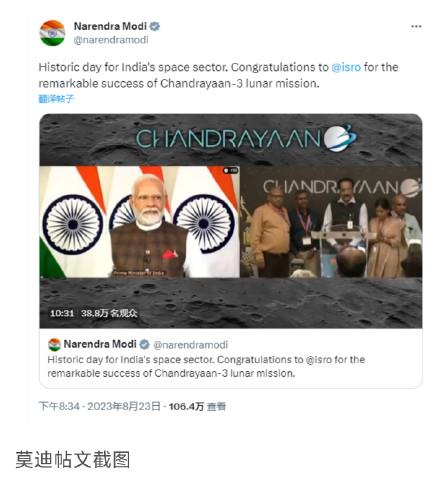 在太空探索领域,中美两国一直是备受关注的焦点。而印度在8月23日,“月船3号”月球探测器成功在月球表面上软着陆。印度总理莫迪表示:“印度现在登上了月球”。他还在社交媒体X上发文称,“这是印度航天事业中历史性的一天。祝贺‘月船3号’登月任务取得非凡成功”。