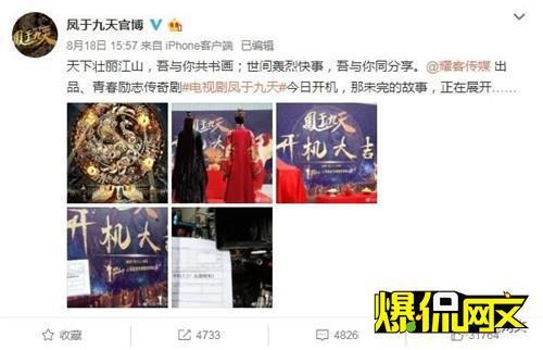 8月18日,根据著名网络作家风弄原著小说改编的电视剧《凤于九天》官博晒照宣布正式开机。