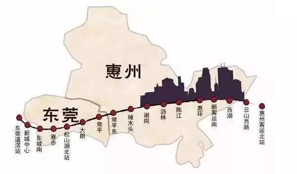 莞惠城轨常平东站至小金口站区段沿线共设常平东、樟木头东、银瓶、沥林北、仲恺、惠环、龙丰、西湖东、云山、小金口等10个客运业务办理车站,全长53公里。