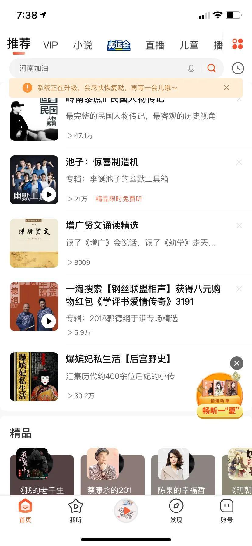 喜马拉雅竟然崩掉了,听着听着就没了,一直提示系统升级,我正听到关键时刻,居然崩溃了[发怒]还以为自己网络问题,各种重启[吐血],差点就重装了,真是晕死啦[抠鼻]不知道什么时候好呢,APP崩掉,会员不会员的,都一样[汗]难道提前感受到台风烟花的影响,自动开启自我保护了[汗]