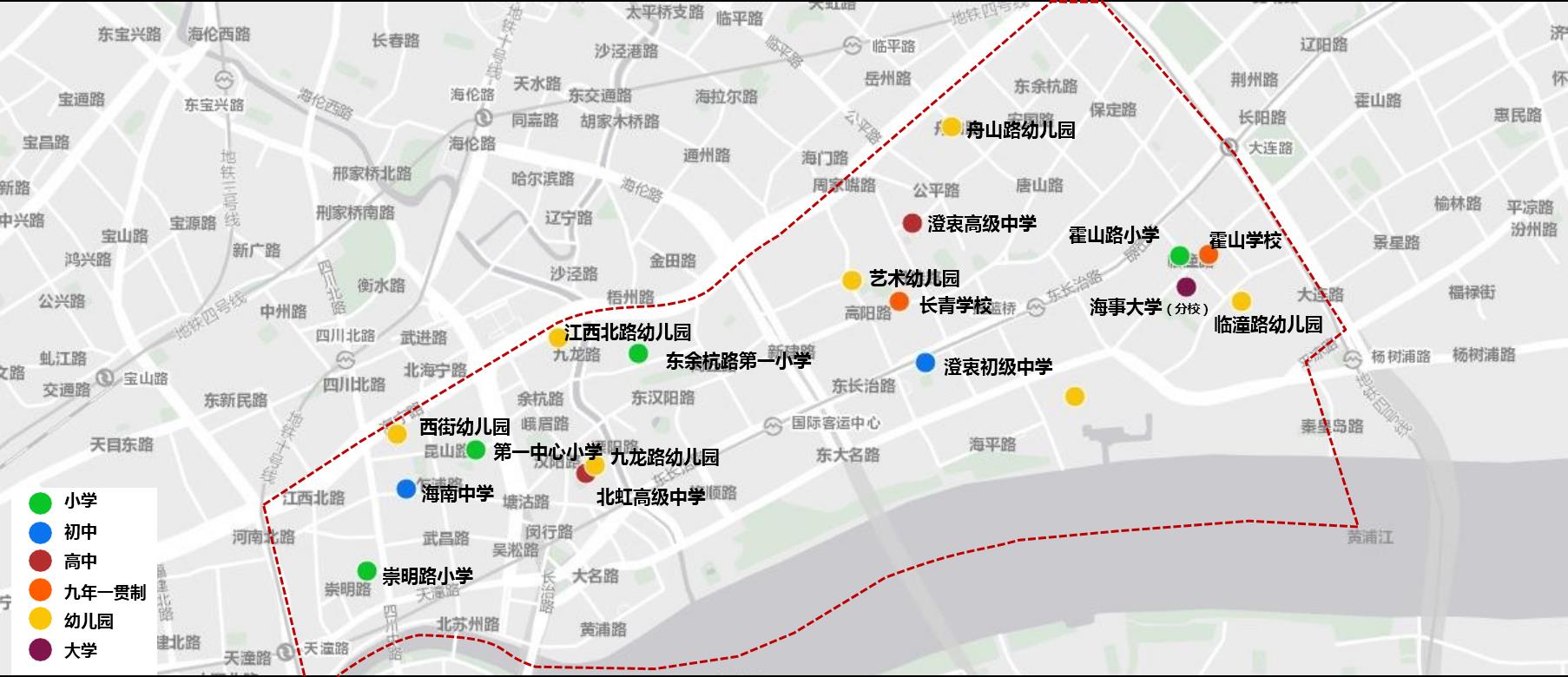 教育方面,北外滩区域云集了共计约18所各类幼儿园、小学、初中、高中和大学,覆盖了各学龄阶段层次的上学需求。同时为增强北外滩地区教育资 源,规划中北外滩在现有幼儿园、小学、中学的基础上,将再新建2所幼儿园、1所小学、2所九年一贯制学校、1所完中,届时各类学校服务覆盖 率将达到90%,满足地区规划7万人规模的教育需求。